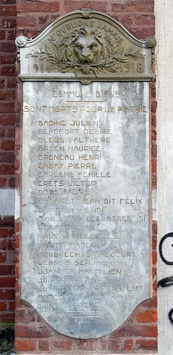 Monument aux morts, sur la façade de l’ancienne maison communale d’Ans, place Nicolaï n°2.
