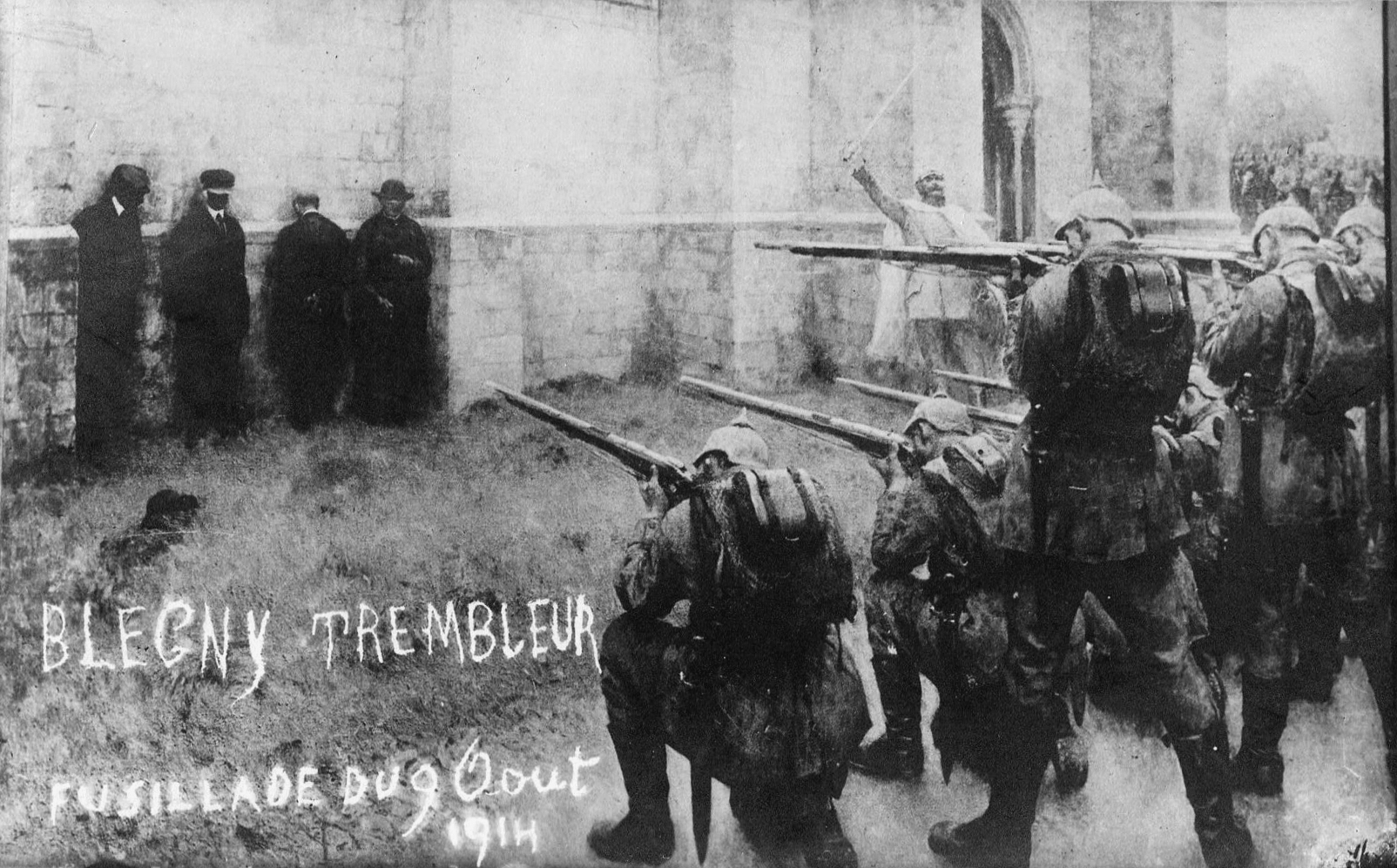 La première carte postale représente l’exécution du 16 août 1914. Sont fusillés : Mr. Labeye, curé de Blegny, Mr. Ruwet, bourgmestre et deux frères du nom de Hacquin. (Peinture d’Evariste Carpentier – 1845-1922). L’annotation sur la carte, concernant la date est erronée.