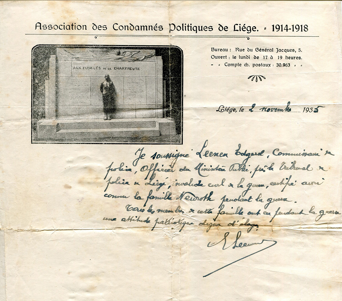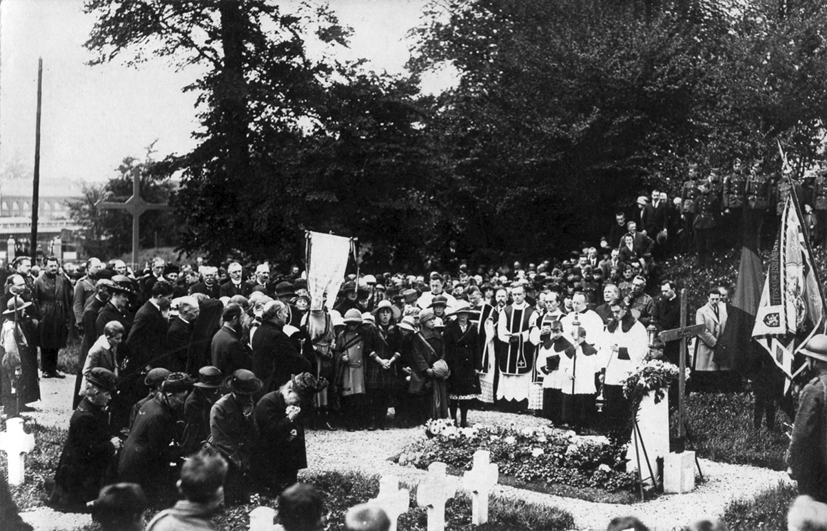 Juillet 1919, visite du président français, Monsieur Raymond Poincarré, du cimetière où sont enterrés les Belges fusillés par les Allemands pour espionnage. Plusieurs de ces martyrs servaient la France.