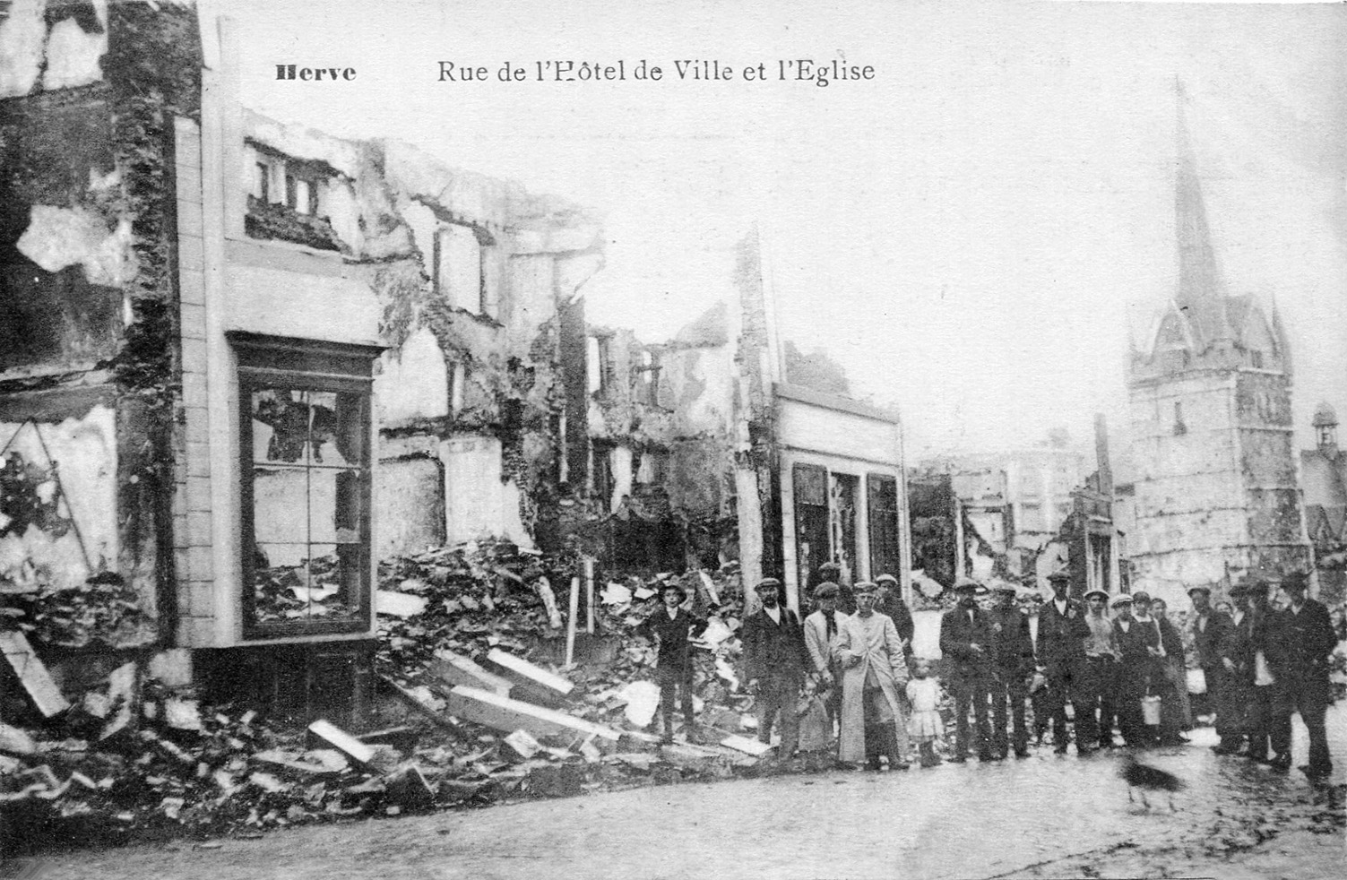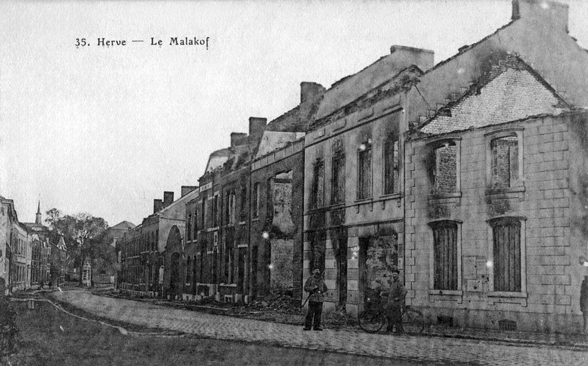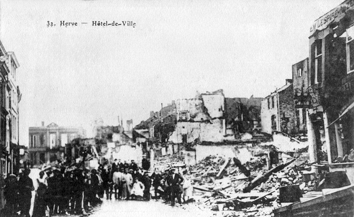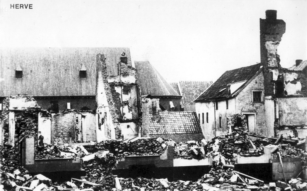 Herve a le douloureux privilège d’être la première ville martyre de Belgique, dès le début de la première guerre mondiale. Les Allemands traversent la ville dès le 4 août, mais les 5 et 6 août, frustrés par la défense inattendue du fort de Fléron, les Allemands en retraite mettent la ville à sac : pillage exécutions de civils, bâtiments incendiés.