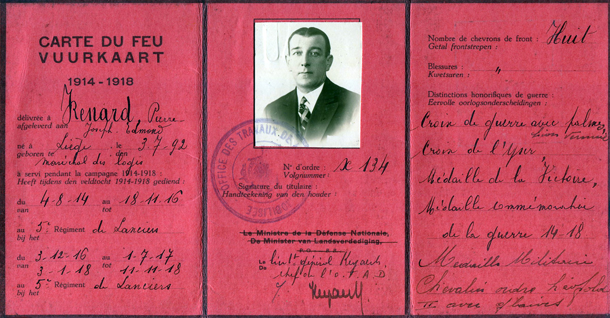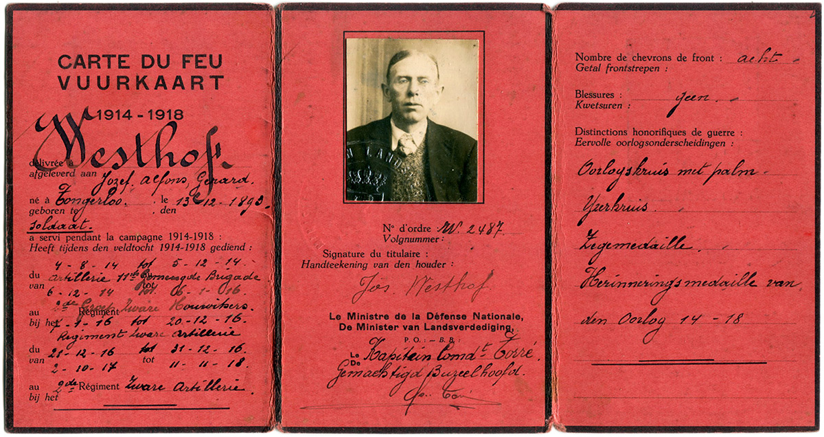 Les soldats belges ayant combattu sur le front, on dû attendre 1932 pour être distingués. C’est en effet au mois de mai de cette année que la Carte du Feu est créée, par l’arrêté royal du 14 mai 1932, pour être attribuée aux Belges ayant servi 12 mois minimum au sein d’une unité au contact de l’ennemi.