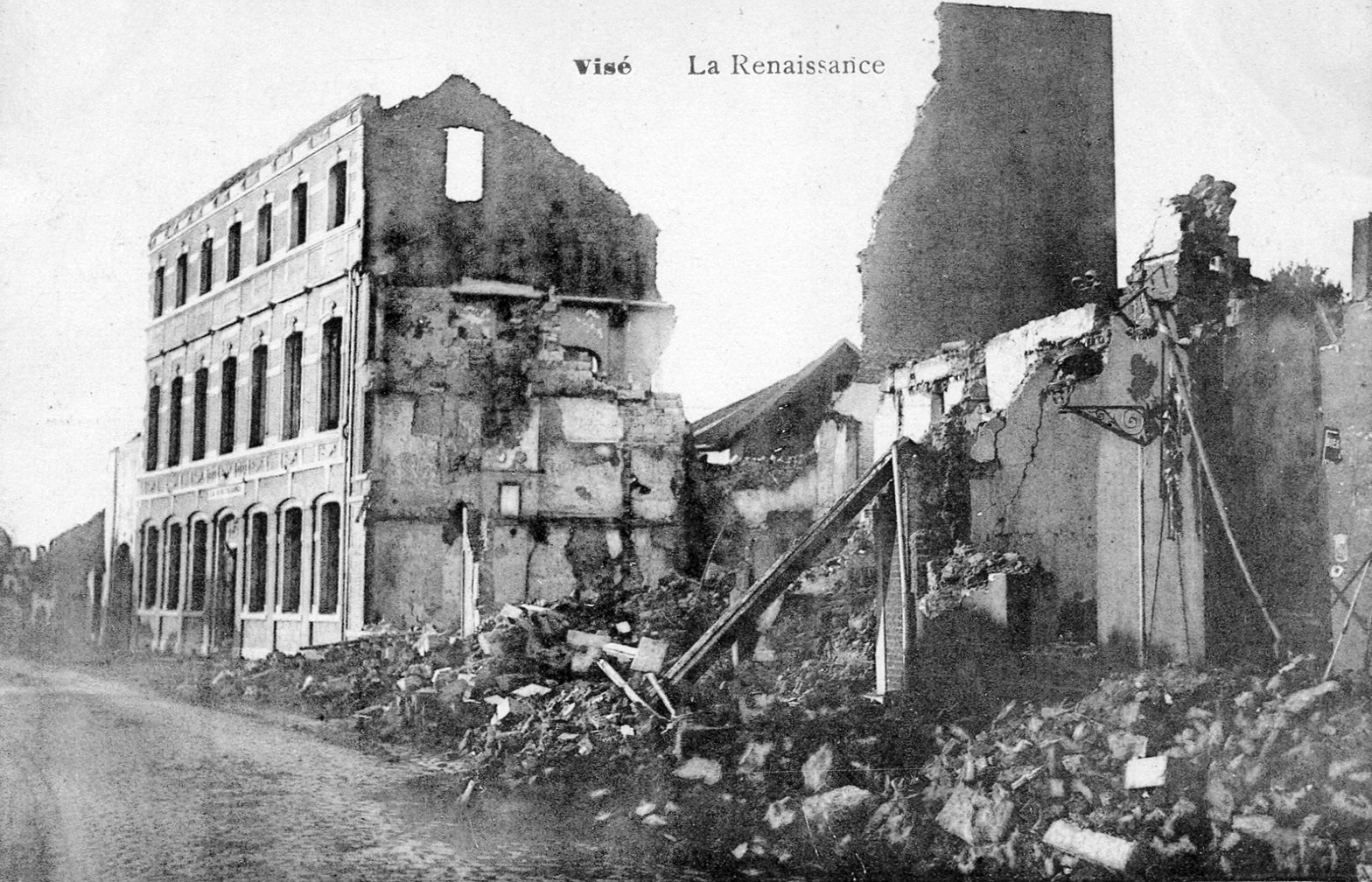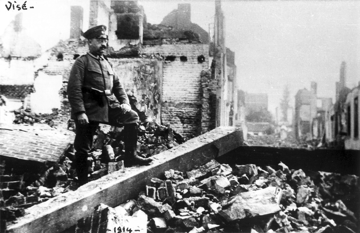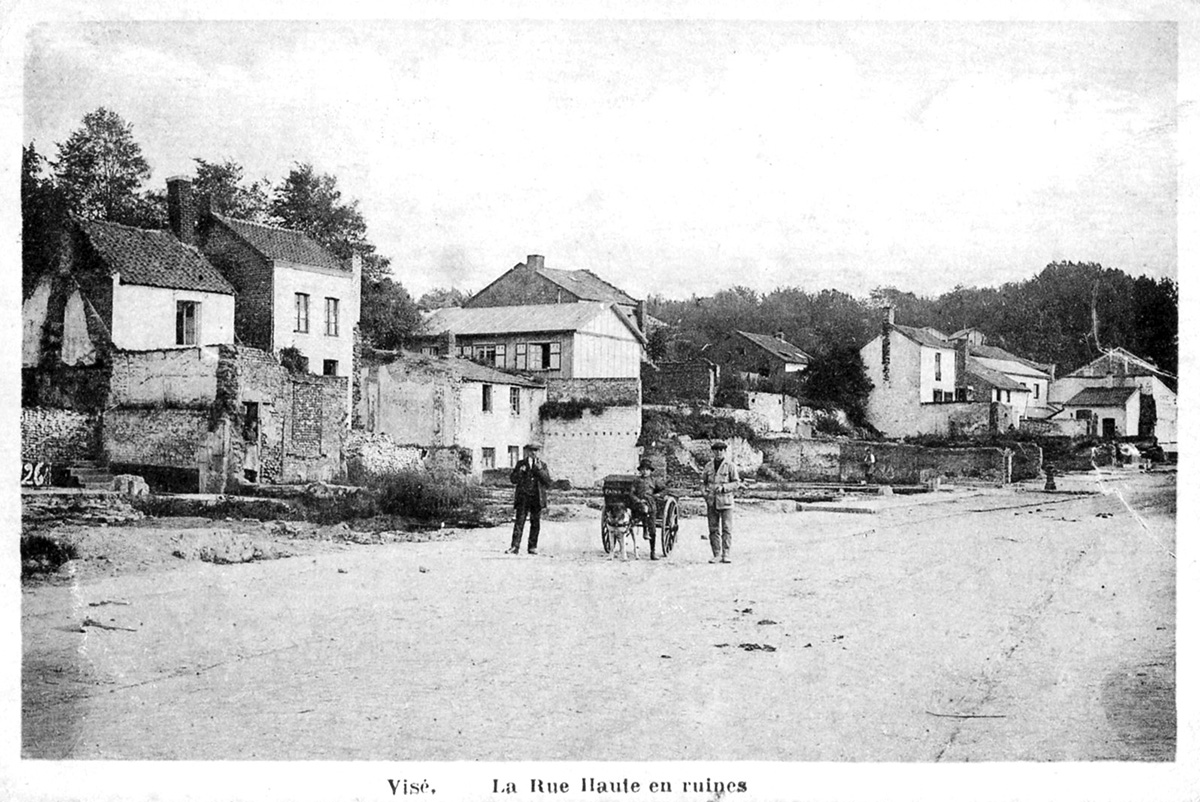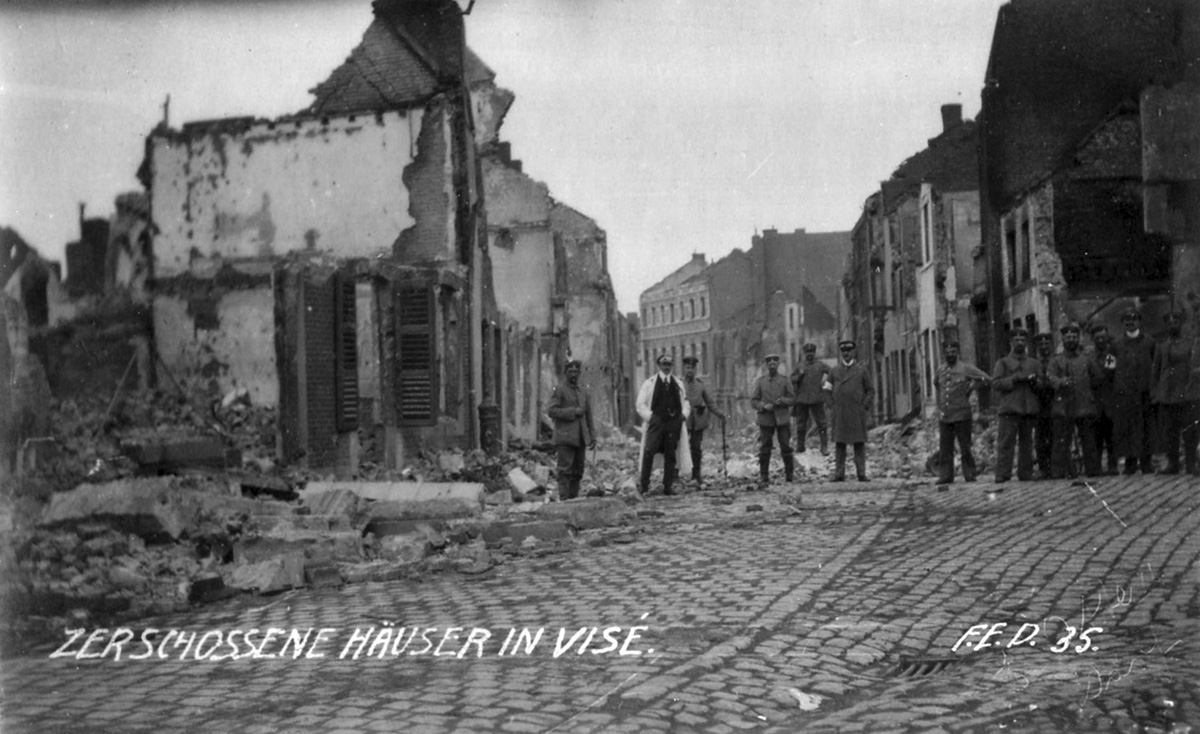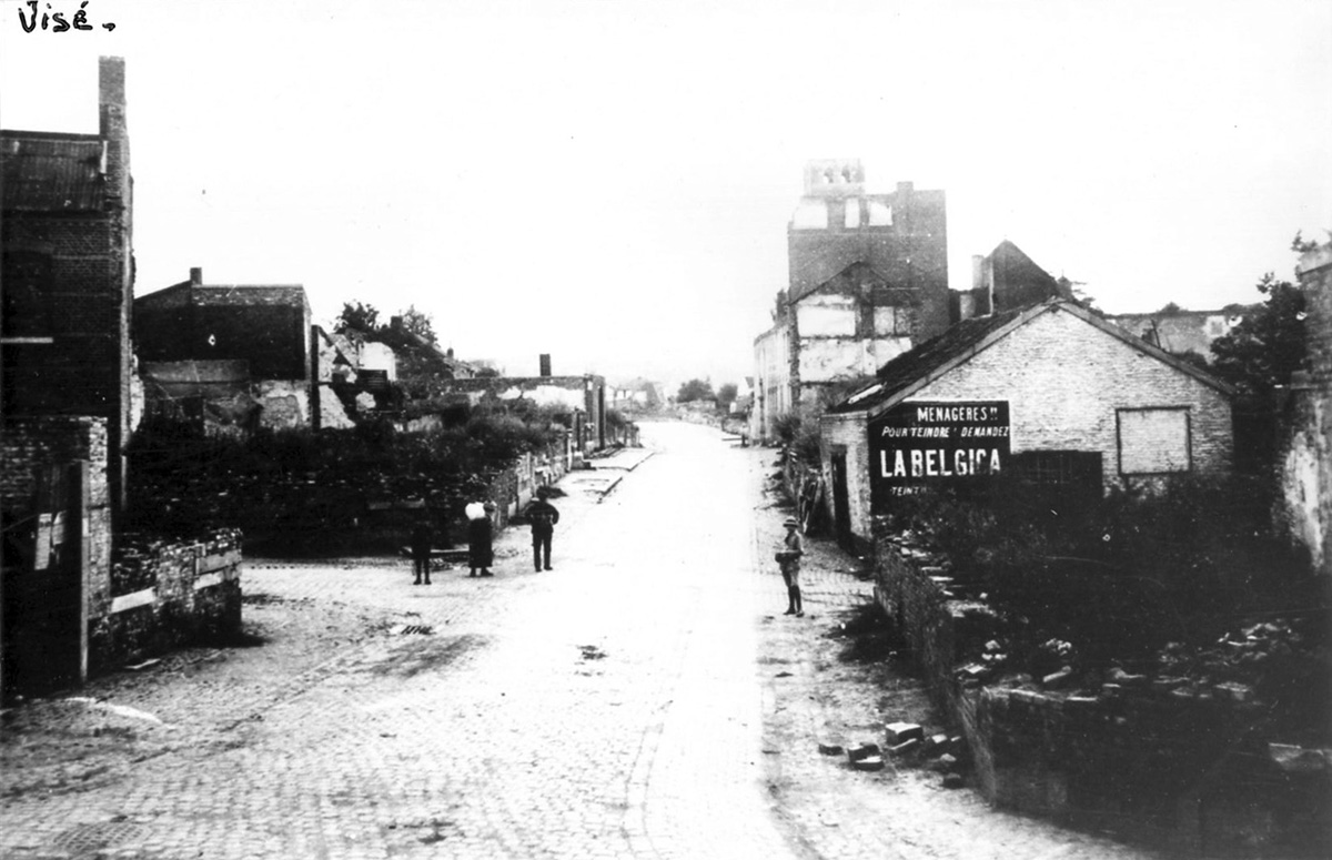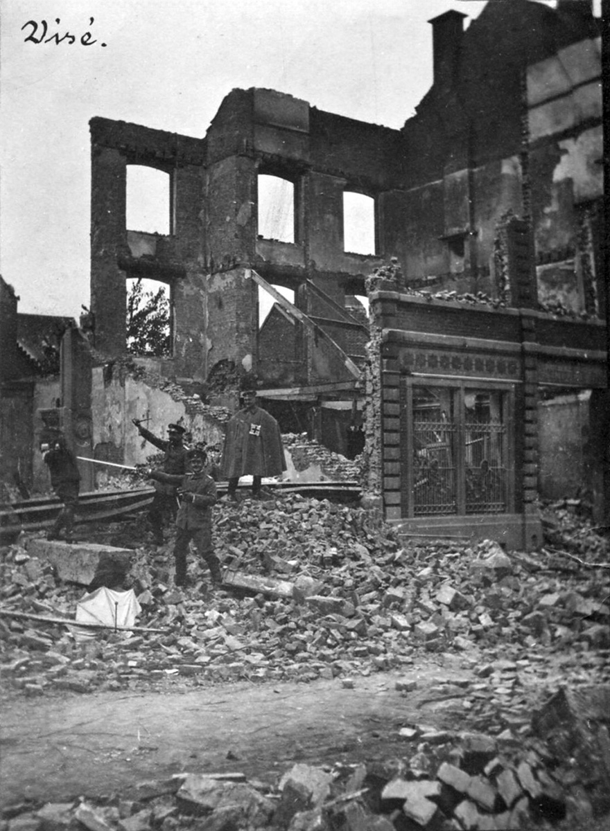 Les ravages causés par la guerre à Visé. Les soldats allemands fouillent les maisons détruites et les décombres.