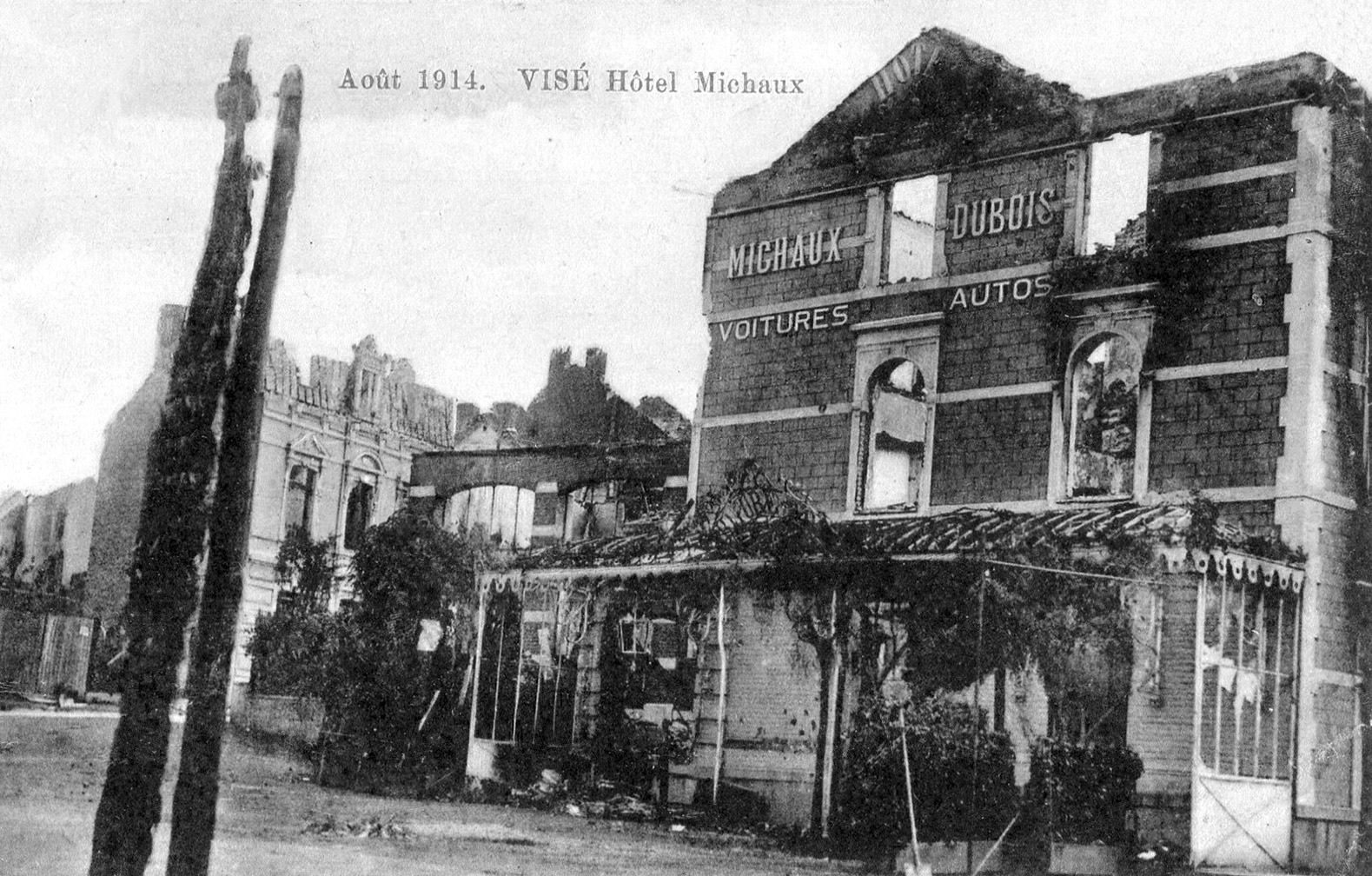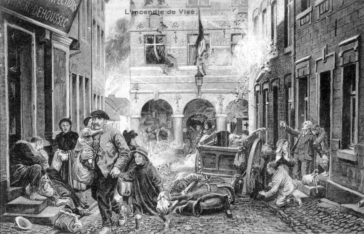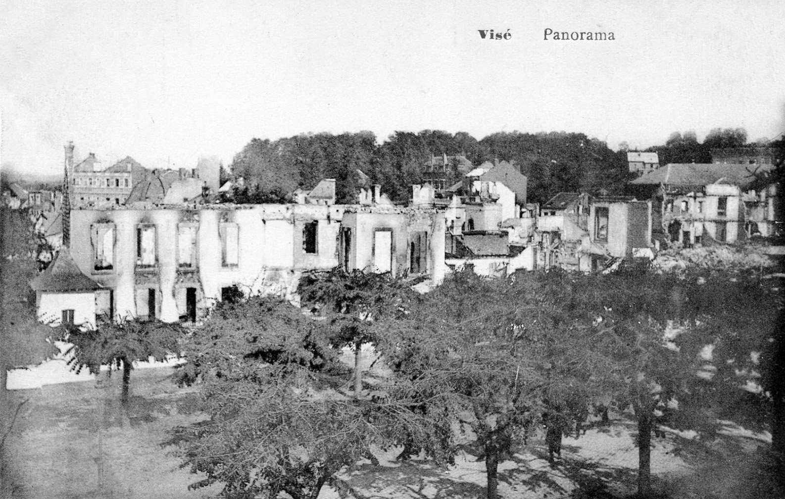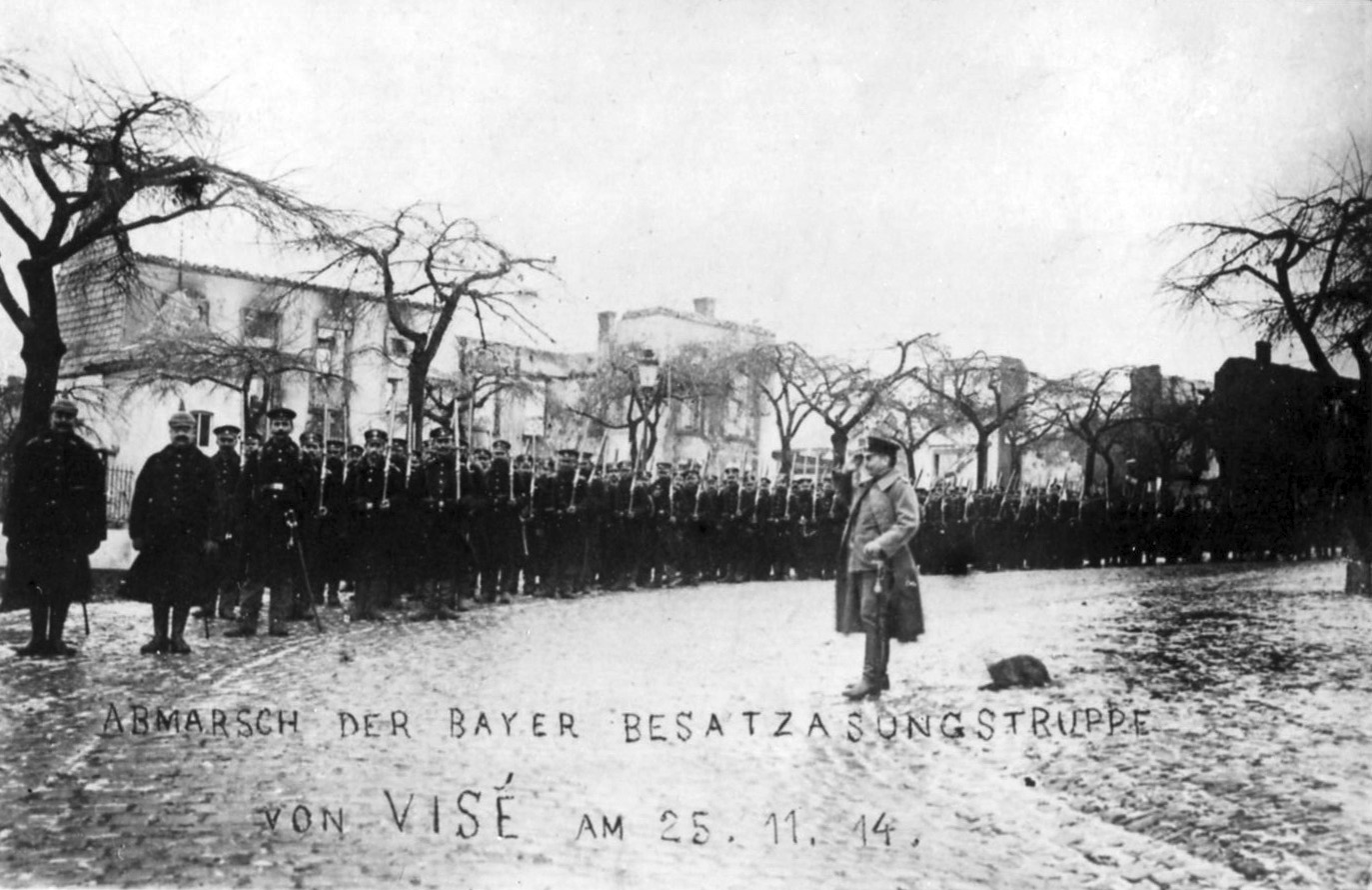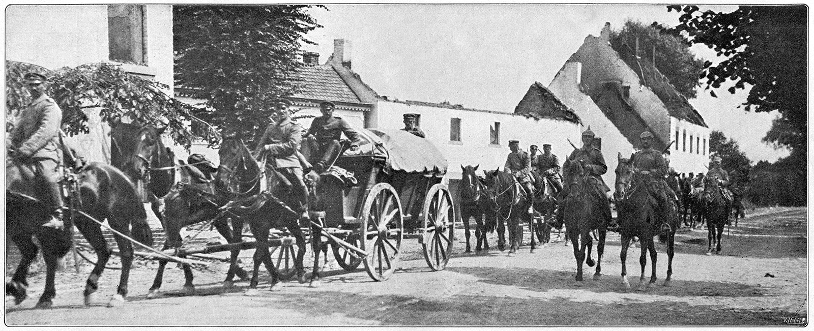 Le train de bagages d'une brigade de l'armée allemande traverse Visé. La quantité de véhicules était si énorme que la traversée de la ville prit plusieurs heures.