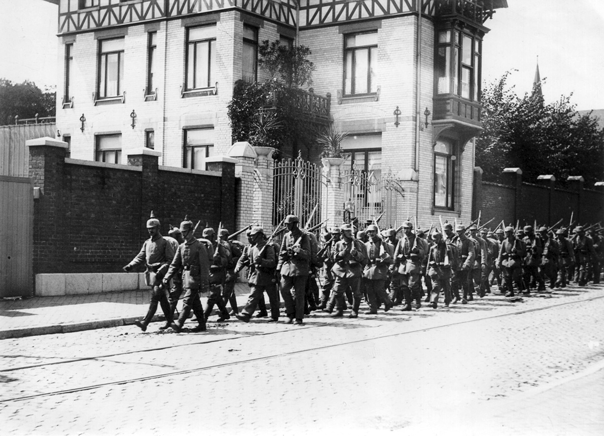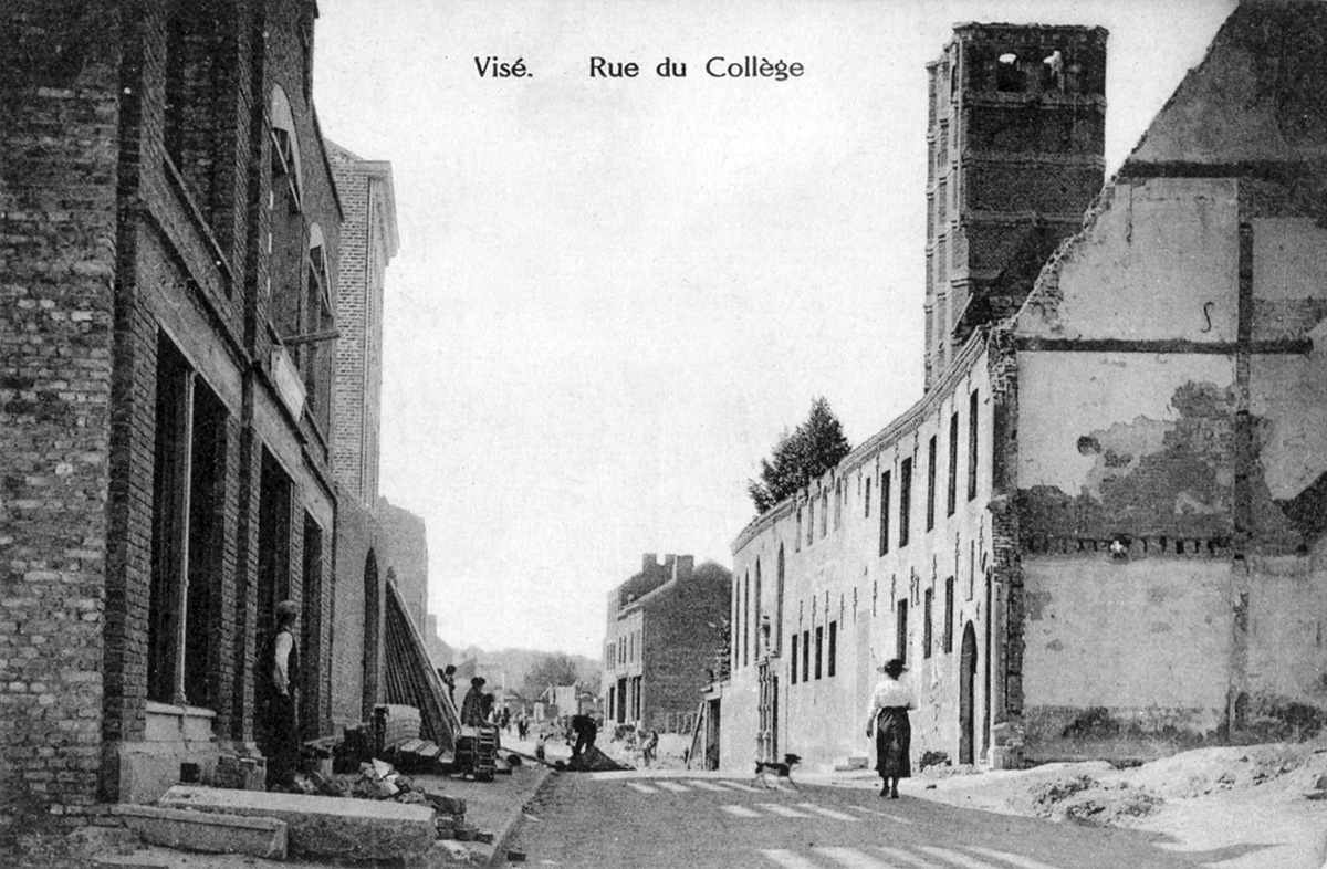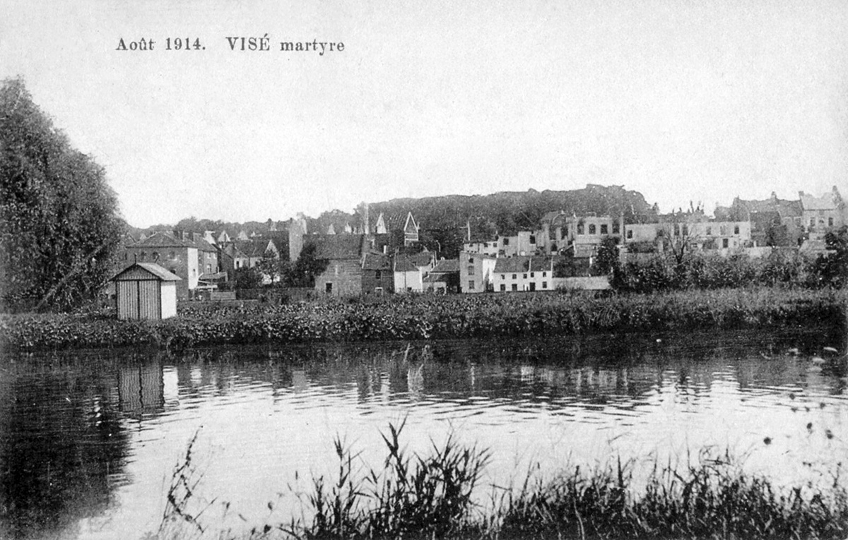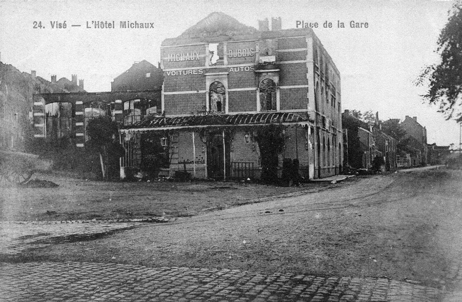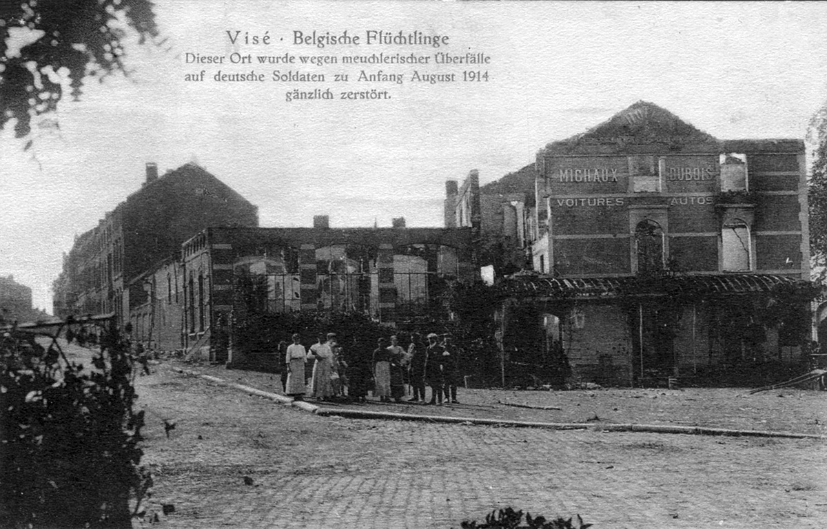 Le train de bagages d'une brigade de l'armée allemande traverse Visé. La quantité de véhicules était si énorme que la traversée de la ville prit plusieurs heures.