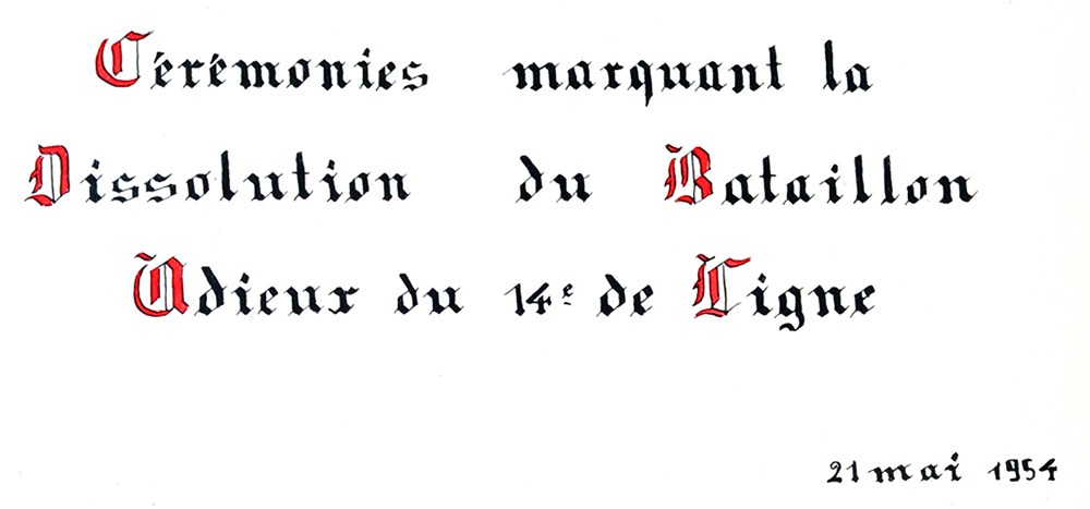 Réception par le Président de la république libre d’Outremeuse.Allocution du chef de Corps.Au monument aux Morts d’Outremeuse.A travers Outremeuse.Le 14 à LiègeUltime prise d’armes boulevard d’Avroy.Dernier défilé.Les adieux du chef de Corps
