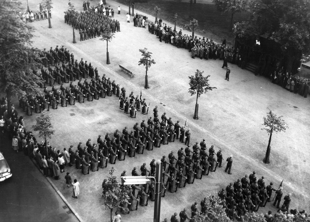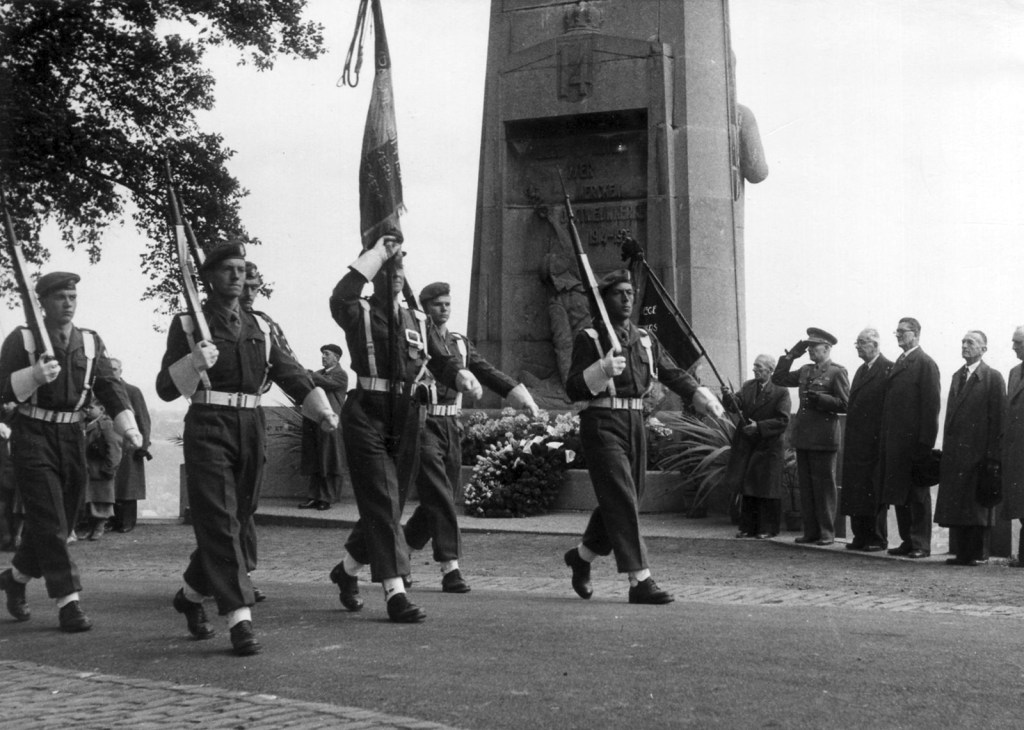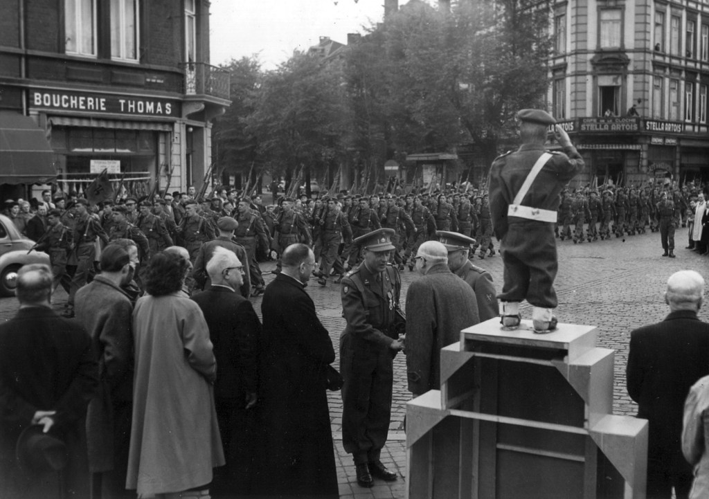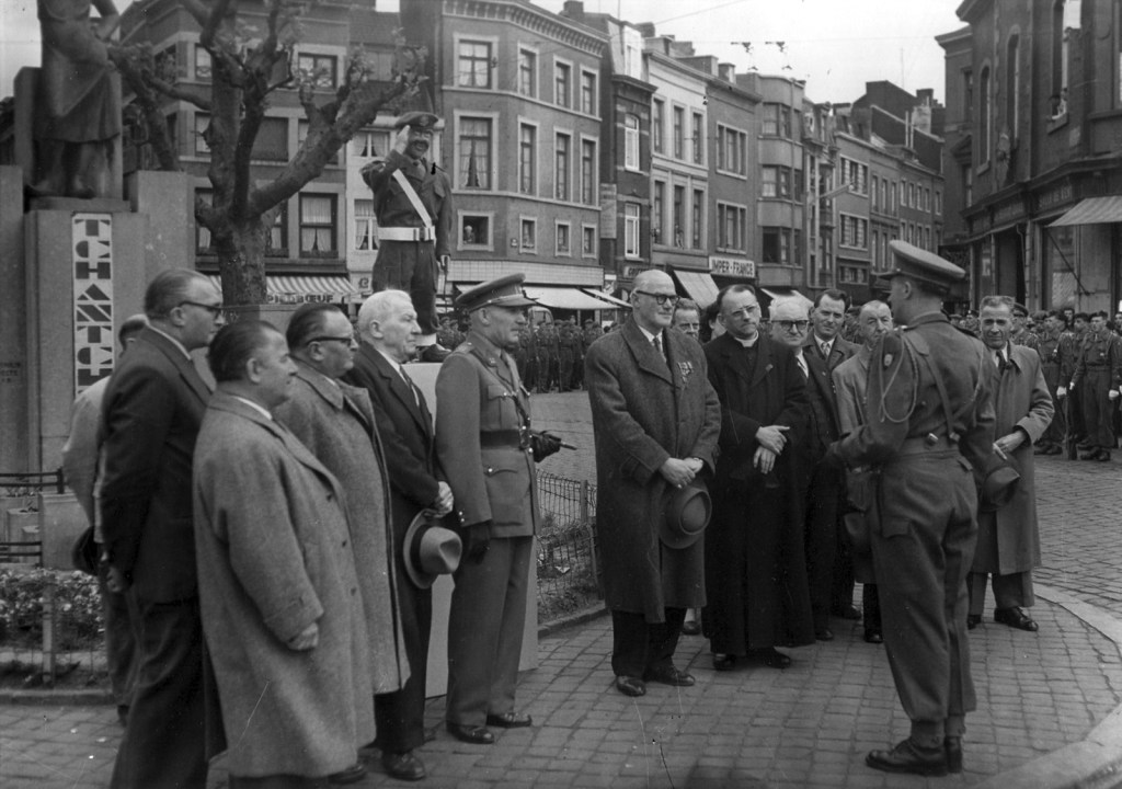 Les personnalités invitées : le Général-Major Mahieu, commandant la 4° Division d'Infanterie, le Colonel Bem Faveere, commandant la 11° Brigade d'Infanterie, le Colonle Bem Lienard, chef d'Etat-Major de la 4° Division d'Infanterie, le Colonel Bem Sevrin, chef d'Etat-Major du 2(BE)Corps, Monsieur le Bâtonnier C. de Pierpont, Président de la Fraternelle des Anciens, et le Lieutenant-Colonel Page, premier chef de Corps du 14Li reconstitué (1951).