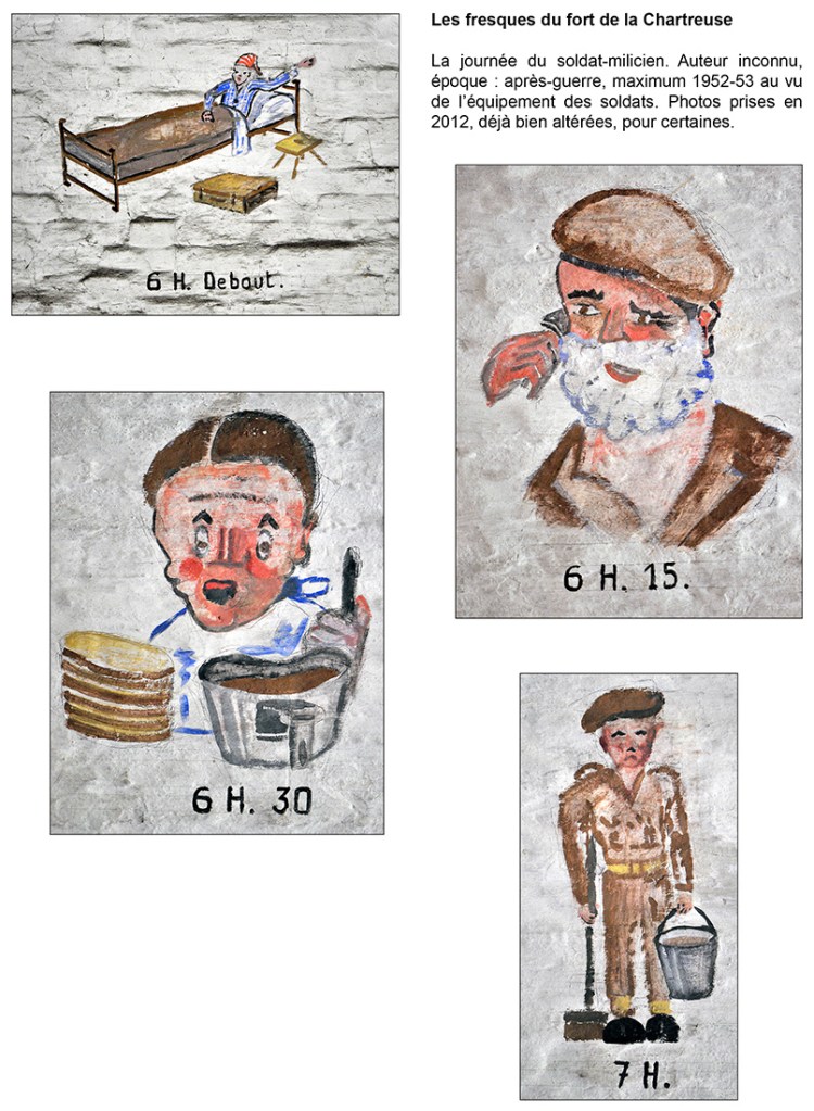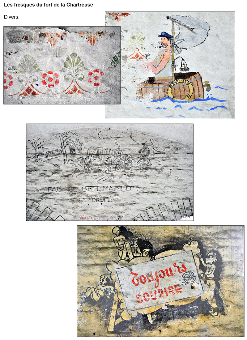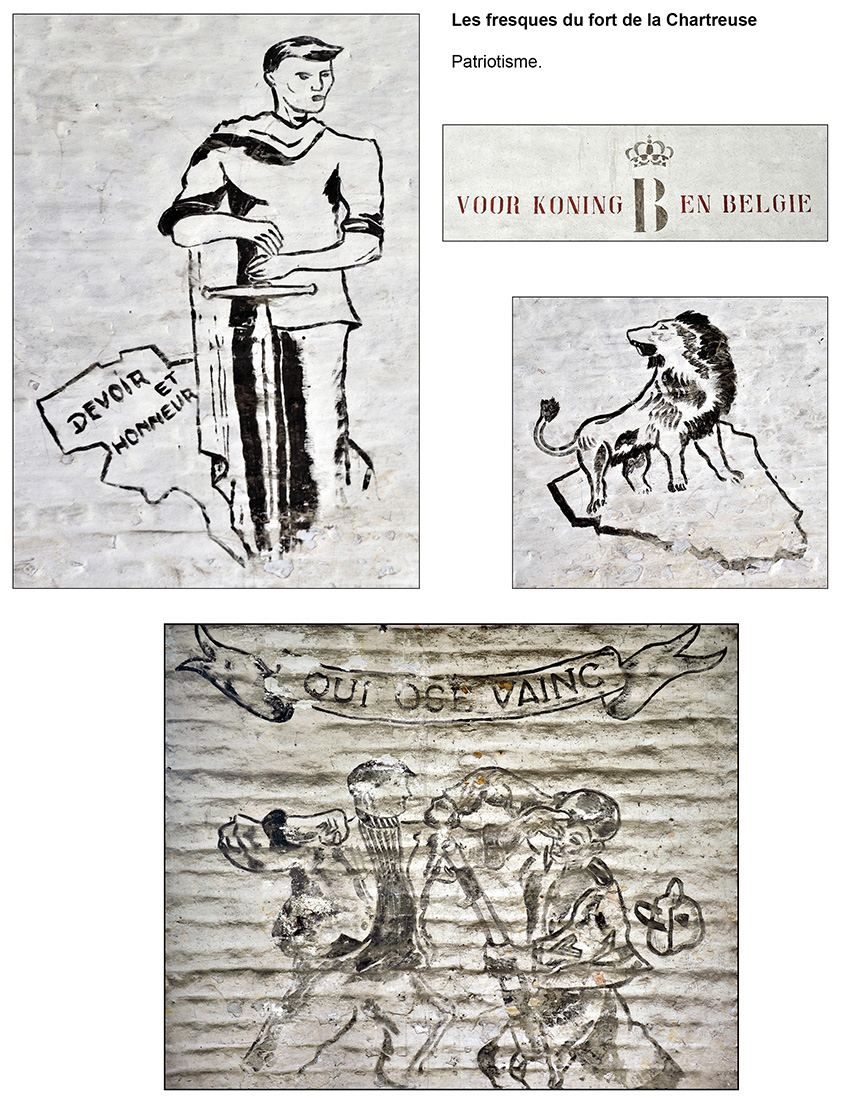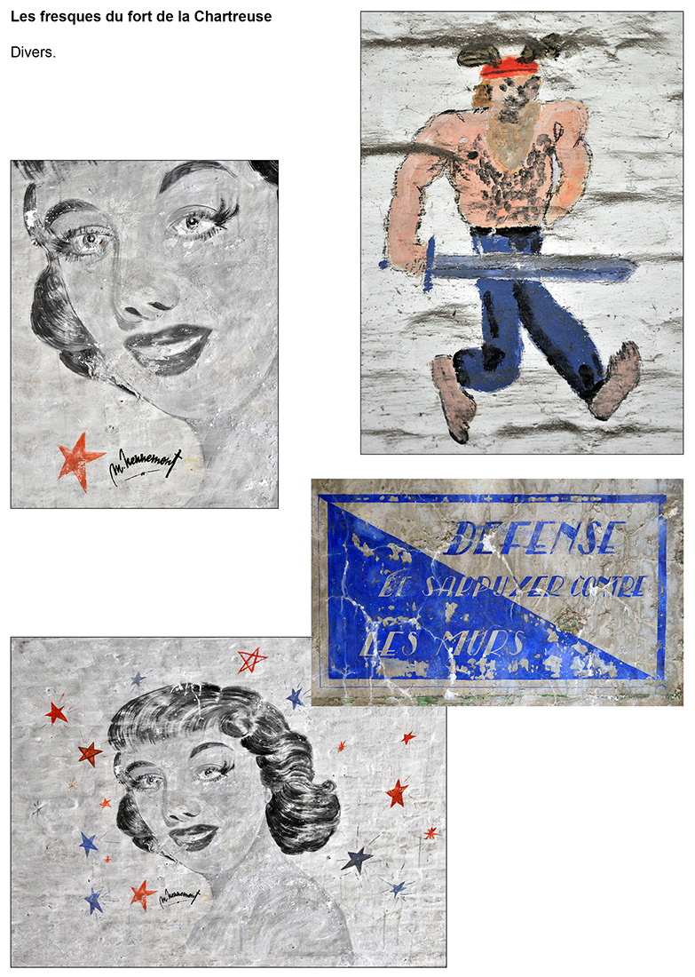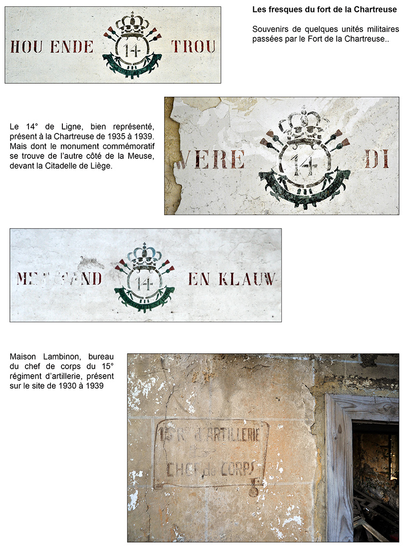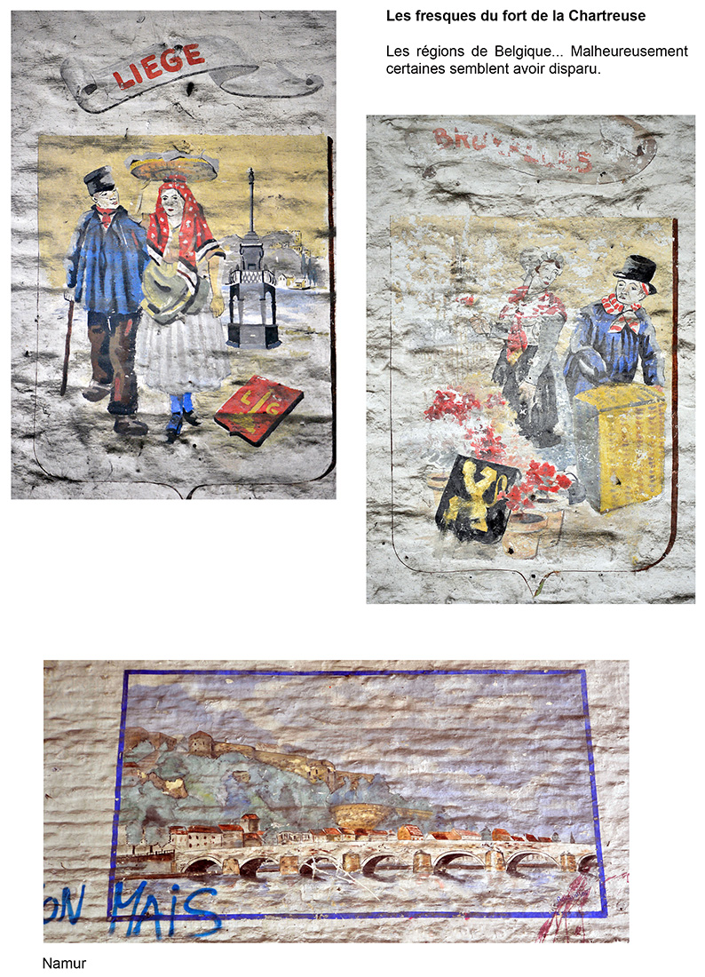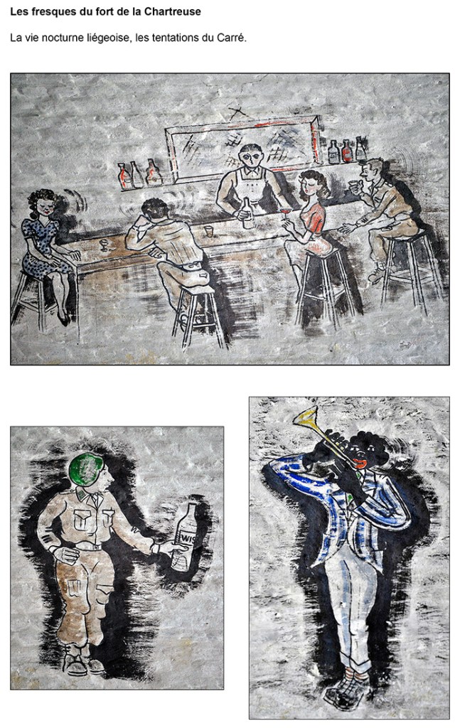 Bâtiment militaire emblématique de la Cité ardente, le fort de la Chartreuse se meurt lentement depuis le départ de l’armée belge en 1988. On y trouve encore de nombreuses fresques probablement peintes par des miliciens à la fibre artistique. Elles se trouvent essentiellement réunies dans le bâtiment principal, l’ancien fort hollandais en U. Les photos reprises ici ont été prises entre les années 2012 et 2013. Il était déjà fort tard, certaines étant dégradées, d’autres ayant carrément disparu, soit à cause du délabrement des bâtiments, soit sous les œuvres de jeunes artistes liégeois en mal de murs à peindre. Les photographier permet de les sauver pour la postérité.