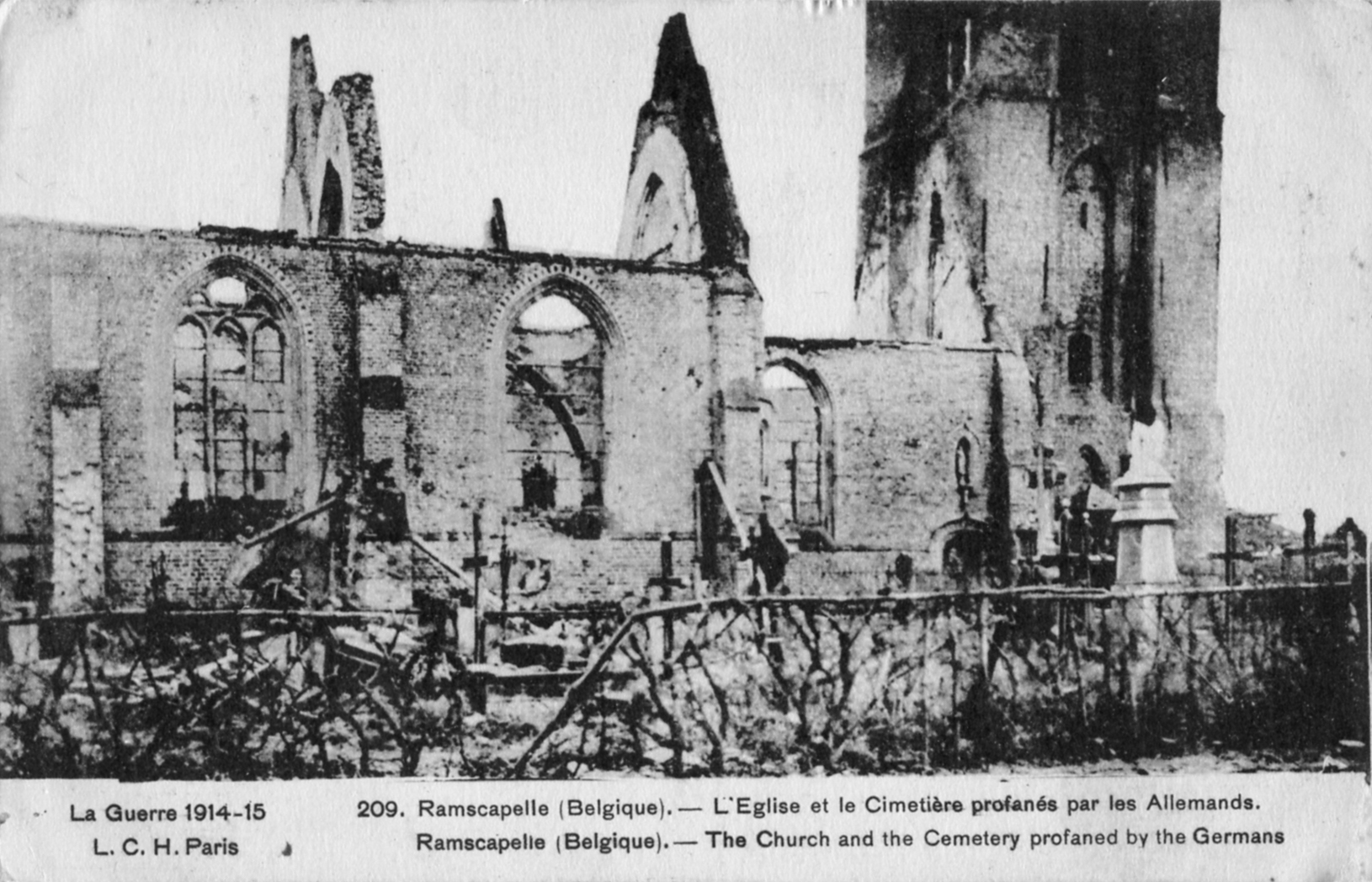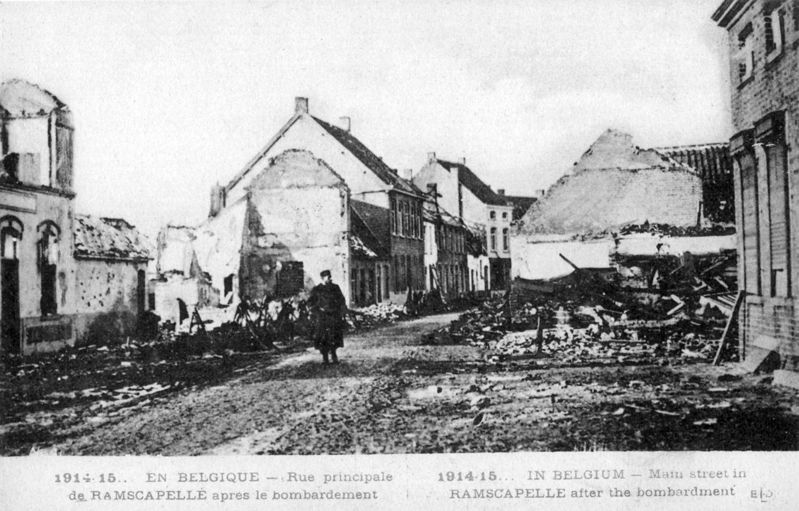 Si début octobre 1914 les Allemands parviennent à occuper Ramskapelle, quelques jours plus tard, le 31 octobre, ils en sont chassés par une violente contre-offensive menée conjointement "à la baïonnette" par des éléments de l'armée belge (6e Régiment de ligne) et de l'armée française (16e Bataillon de chasseurs à pied). Plus de 100 soldats belges et de nombreux Français y laissent la vie. Le village est gravement endommagé. La gare, l’église et maintes maisons sont en ruine.