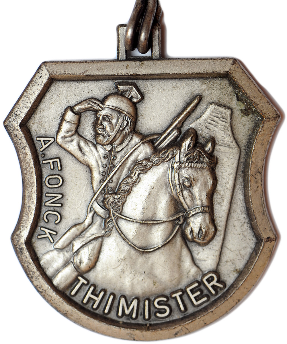 Divers souvenirs liés au cavalier Fonck : statuette représentant le monument Fonck. Celle-ci a été offerte à ma grand-mère, institutrice retraitée de l’école communale de Froidthier (Clermont sur Berwinne). La médaille est probablement un trophée sportif. La carte postale reproduit une oeuvre du peintre Evariste Carpentier, qui relate la mort du cavalier Fonck. Et enfin, deux plaquettes consacrées au cavalier Fonck.