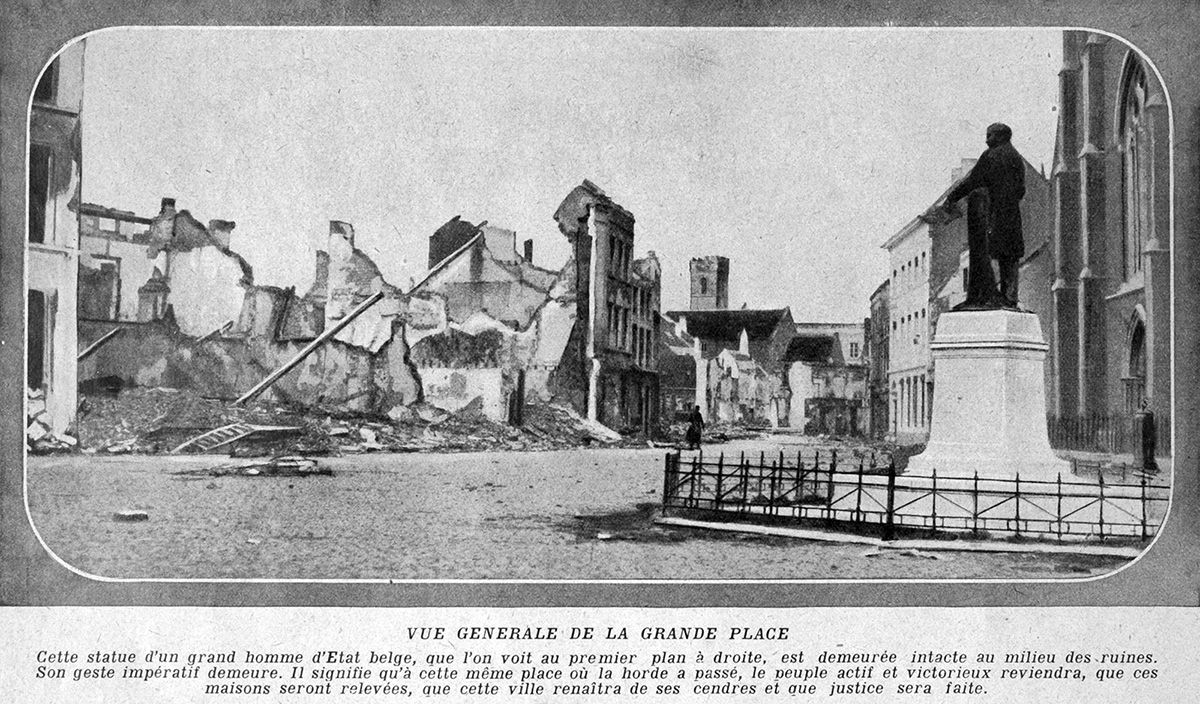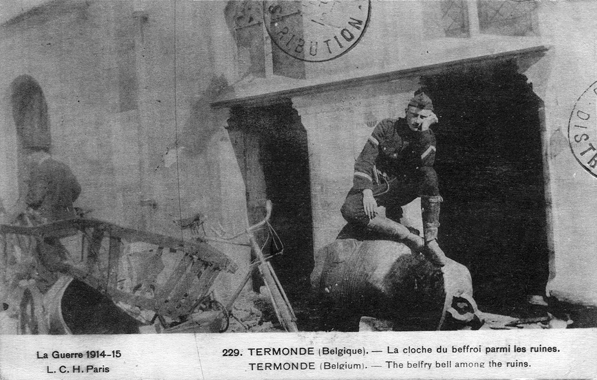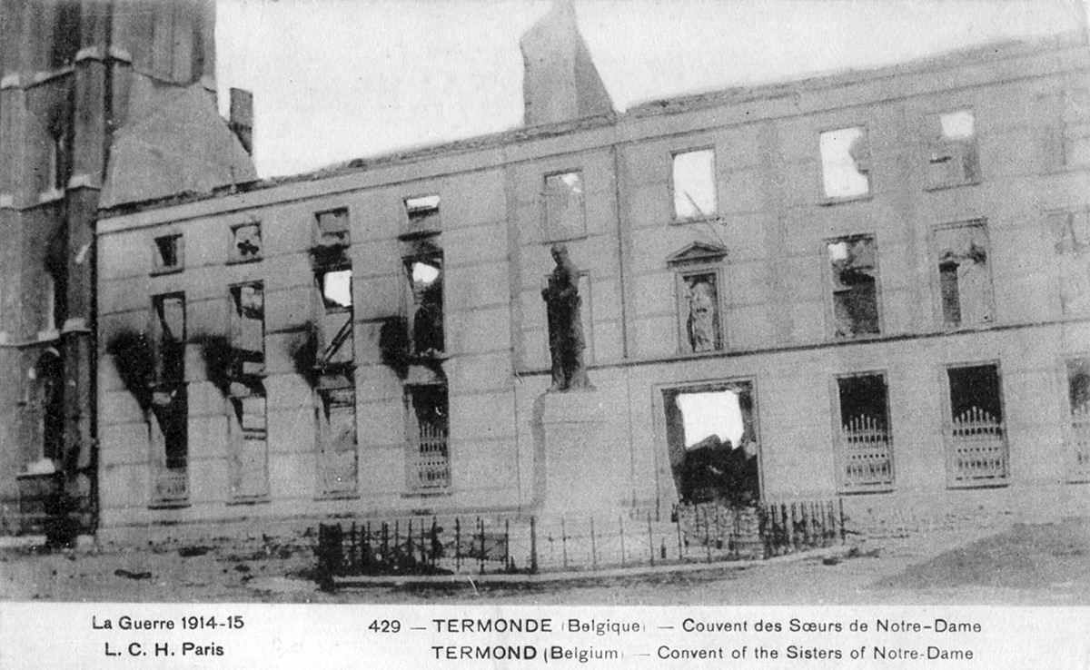 Du 4 au 6 septembre 1914, presque toutes les maisons et les bâtiments publics du centre-ville ont été détruits par le bombardement de l’armée allemande. Le panache de fumée de l’incendie pouvait être vu dans le pays de Waes et à Heusden, près de Gand. La population vivait dans les sous-sols et les casernes. L’hôtel de ville et le beffroi ont été brûlés, de sorte que les archives de la ville ont été perdues. Des habitants de Termonde et du village voisin de Saint-Gilles, pris comme otages, ont été déportés en Allemagne. (Wikipedia)