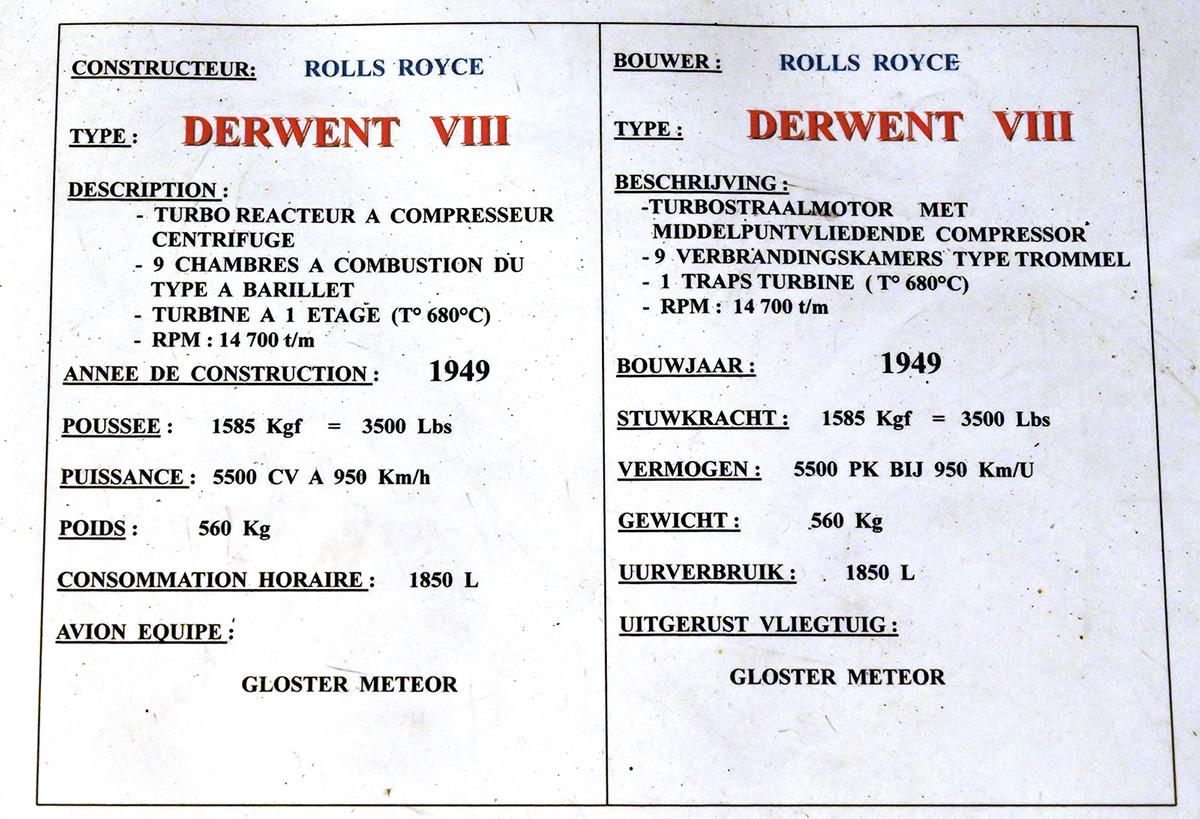 Il existe un exemplaire du Gloster Meteor F8 au 1° Wing Historical Center, ainsi qu’un moteur exposé dans le musée. (Photos JC Geboes)