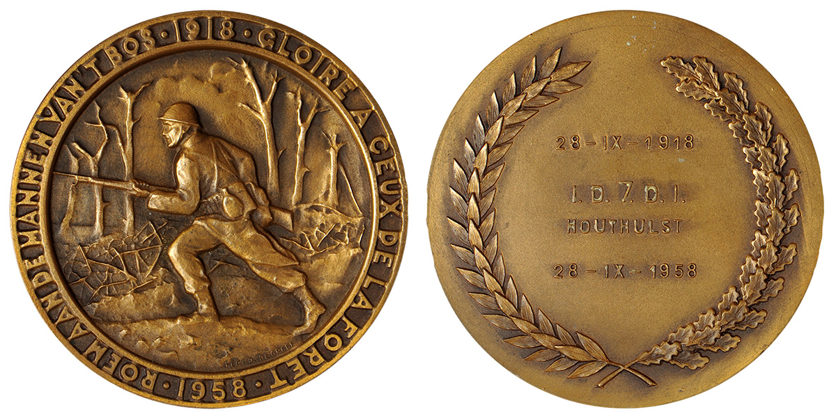 A gauche, médaille des Fraternelles des Combats de la Forêt d’Houthulst. Les fraternelles des régiments ayant participé aux combats pour la prise de la forêt d’Houthulst éditent une médaille à l’occasion du 40° anniversaire, le 28 septembre 1958, de ce haut fait d’armes. Elle est délivrée avec un brevet nominatif. A droite, médaille commémorant la participation du 1er régiment de Chasseurs à Cheval au combat de Reigersvliet en mars 1918.