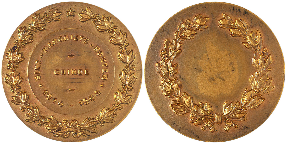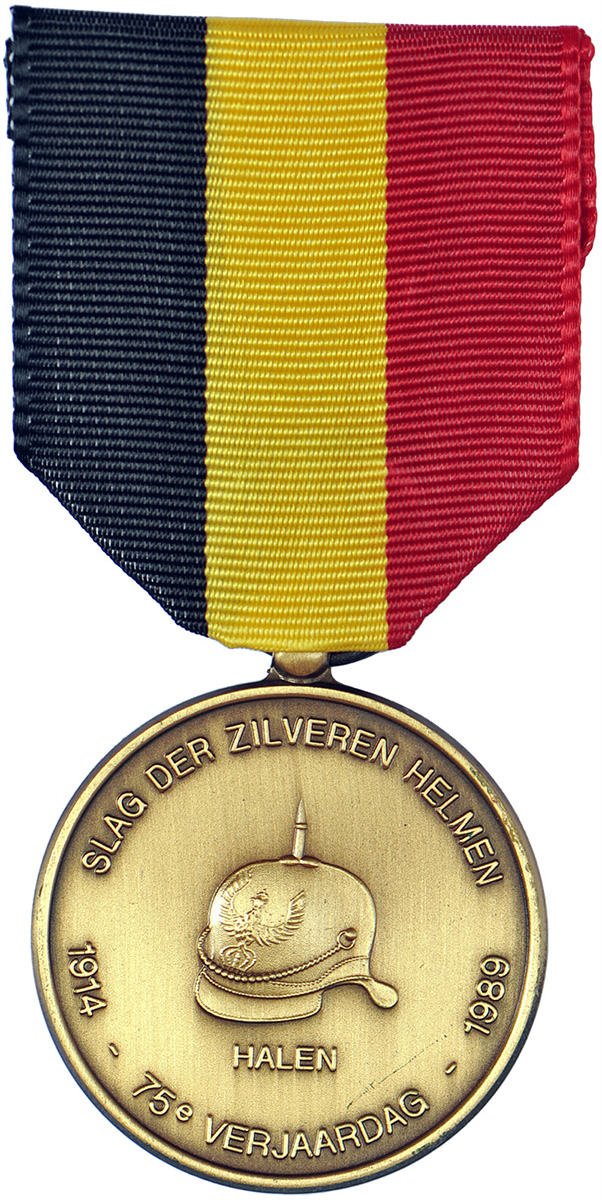 A gauche, médaille du 75° anniversaire de la bataille de Halen, appelée également « bataille des Casques d’argent ». A ne pas confondre avec la médaille créée en 1958 pour honorer les vétérans de cette bataille. Au milieu, une médaille qui commémore la campagne de 1914 entre la bataille de Liège et la bataille de l’Yser. A droite une médaille probablement en hommage aux combats ayant eu lieu aux alentours de la localité de Grimde, près de Tirlemont (Tienen), opposants des soldats belges du 22° de Ligne à l’envahisseur allemand, le 18 août 1914.